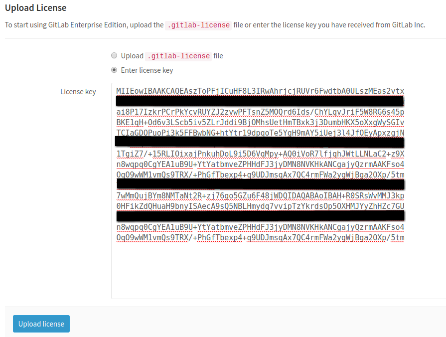 To activate all GitLab Enterprise Edition (EE) functionality, you need to upload a license. Once you've received your license from GitLab Inc., you can upload it by signing into your GitLab instance as an admin.